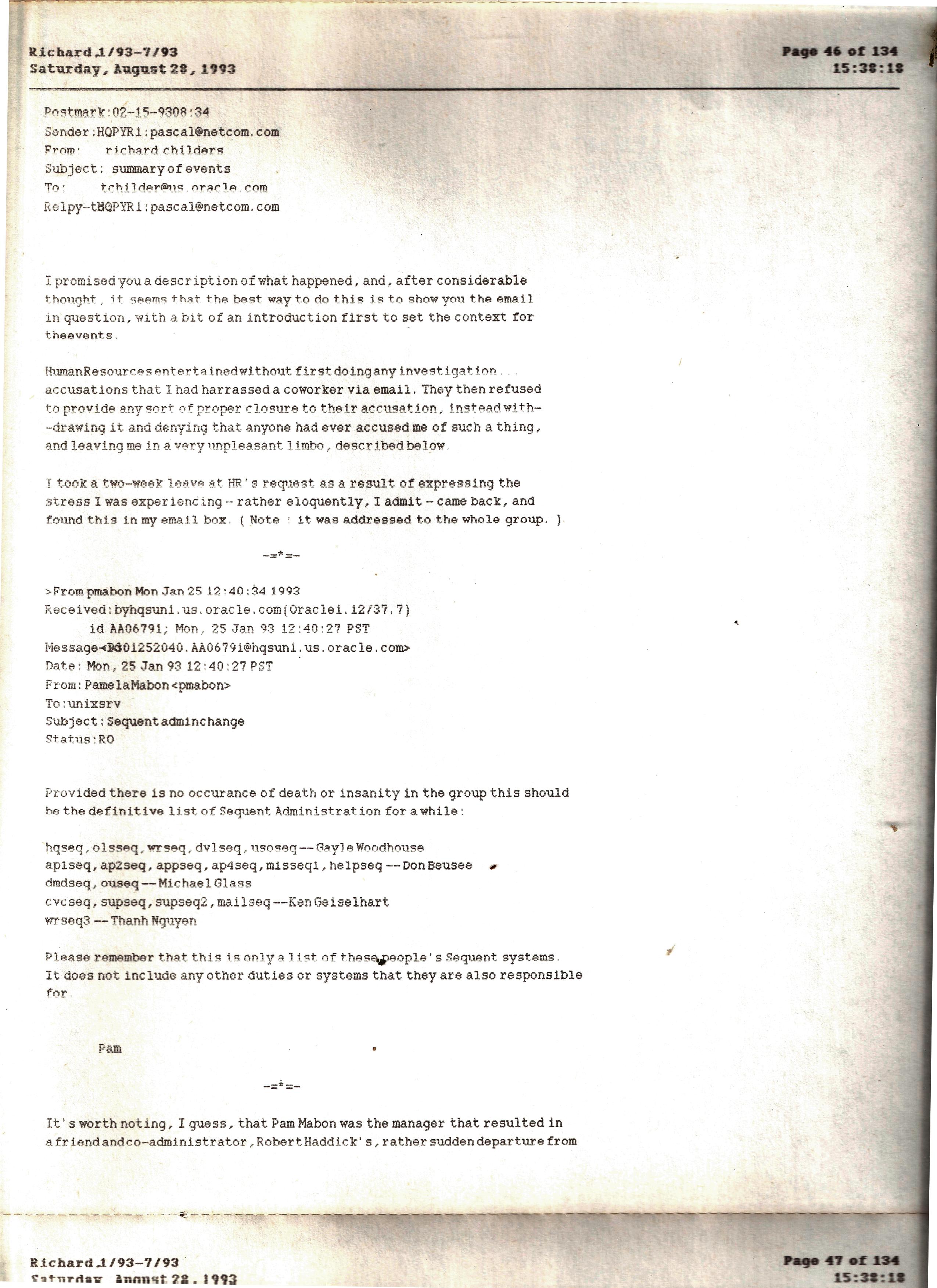 - 25 Jan 1993: Jumping to page 46, we see Ms Mabon's "death or insanity" email [13]