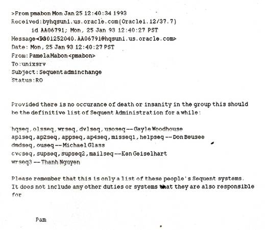 In July of 1991, I began working at Oracle Corporation as a UNIX systems analyst & administrator. I was almost immediately the target of character assassination [1] by someone whom, I have read on the Internet, is the subject of a Massachusetts court order forbidding him from being alone with minors.