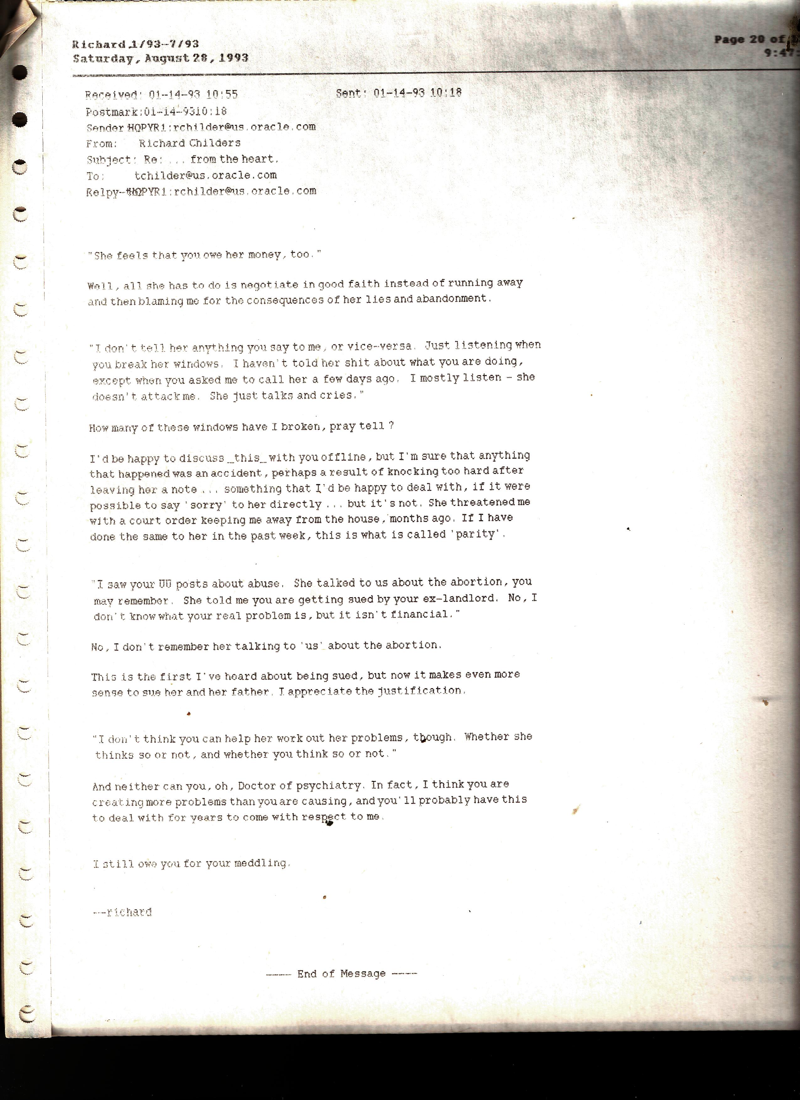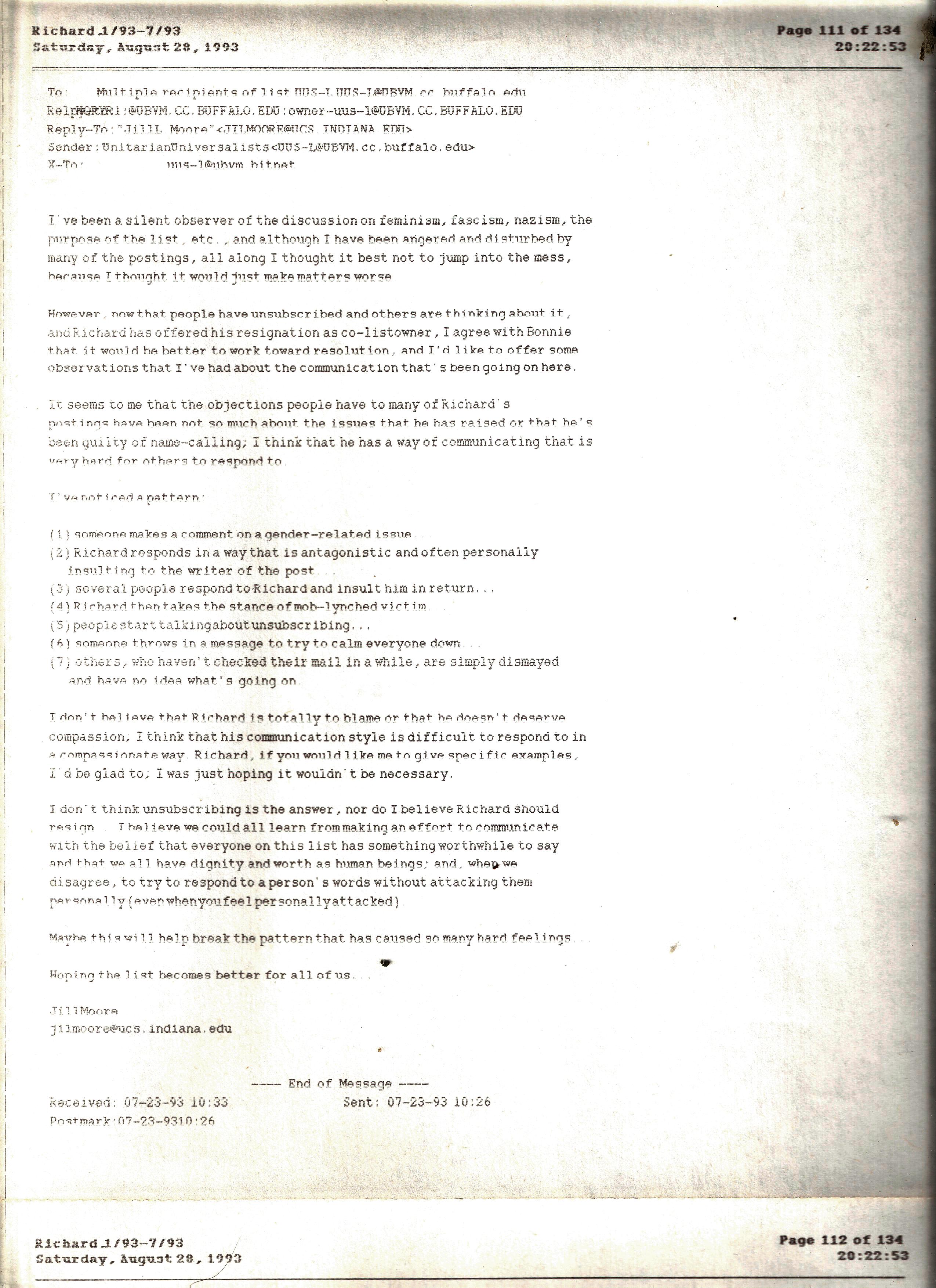 It can be said that the entire 134-page-long printout is all new evidence. Particularly those portions where I am discussing the events relating to my pending termination, at Oracle, with my fellow Unitarians, in our ostensibly private BITNET-based mailing list, UUS-L.