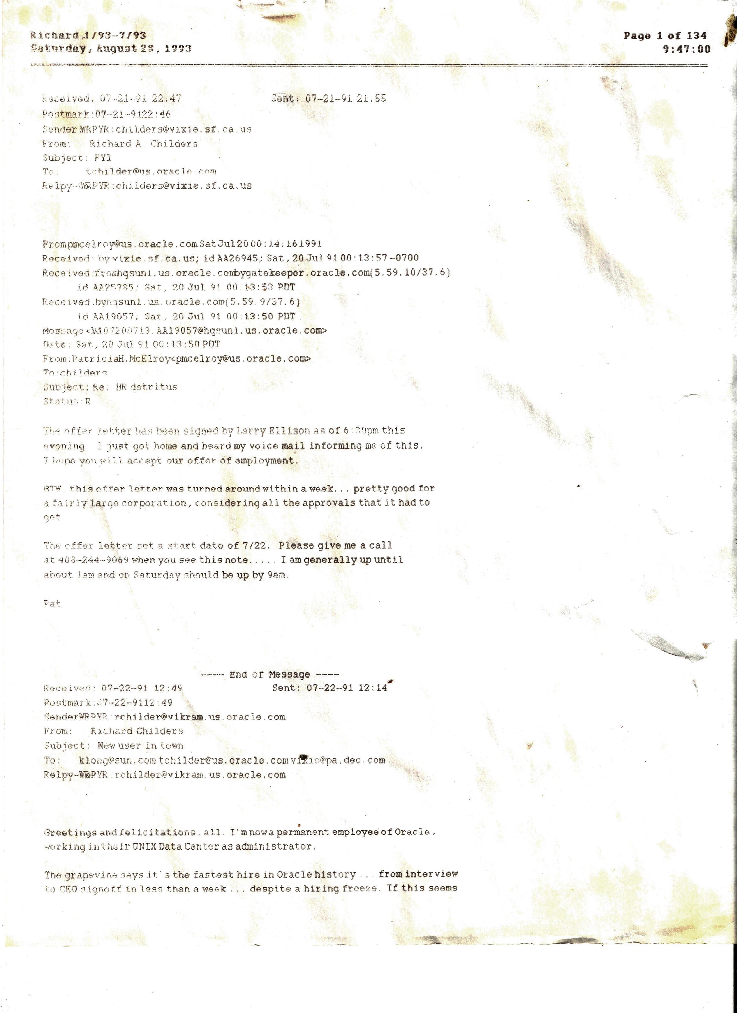 - 22 Jul 1991: On page 1 is the original offer letter [11]