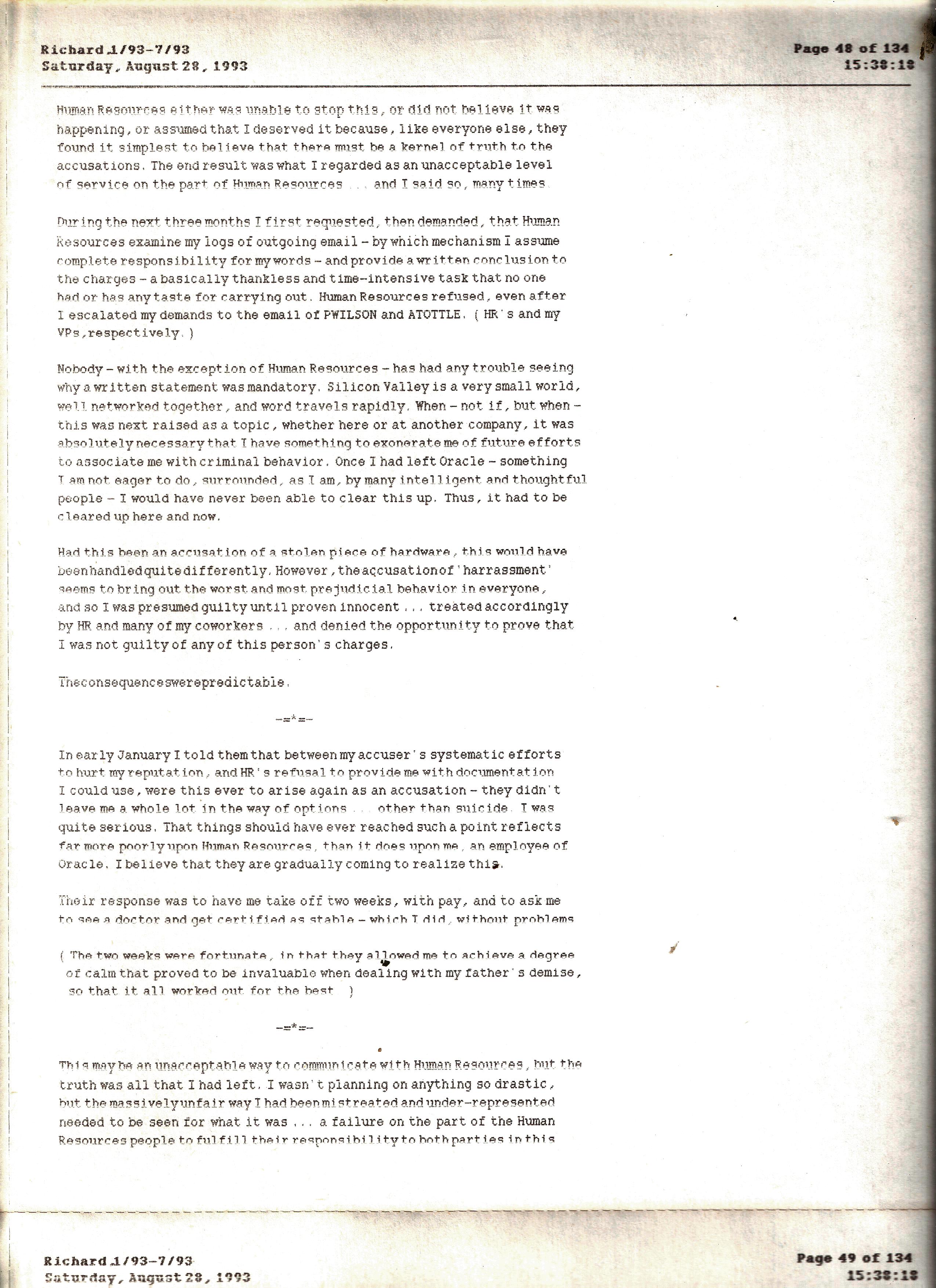 In July of 1991, I began working at Oracle Corporation as a UNIX systems analyst & administrator. I was almost immediately the target of character assassination [1] by someone whom, I have read on the Internet, is the subject of a Massachusetts court order forbidding him from being alone with minors.