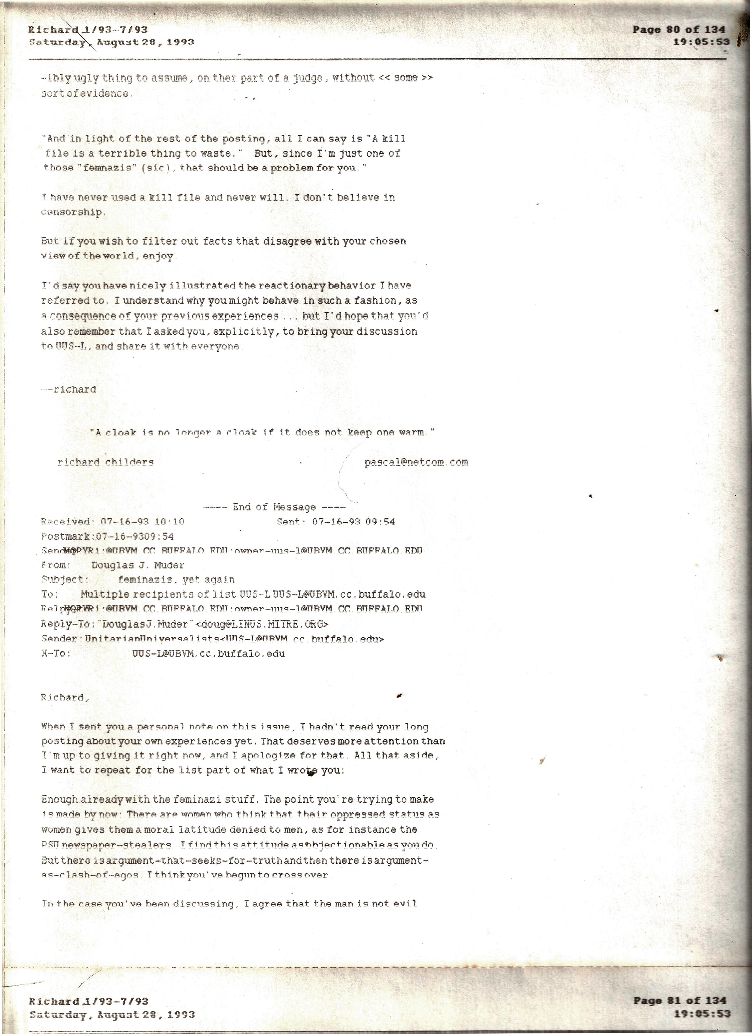 Tom appears to have spent the better part of an entire day - Saturday, August 28, 1993 - printing out emails related to his younger brother: